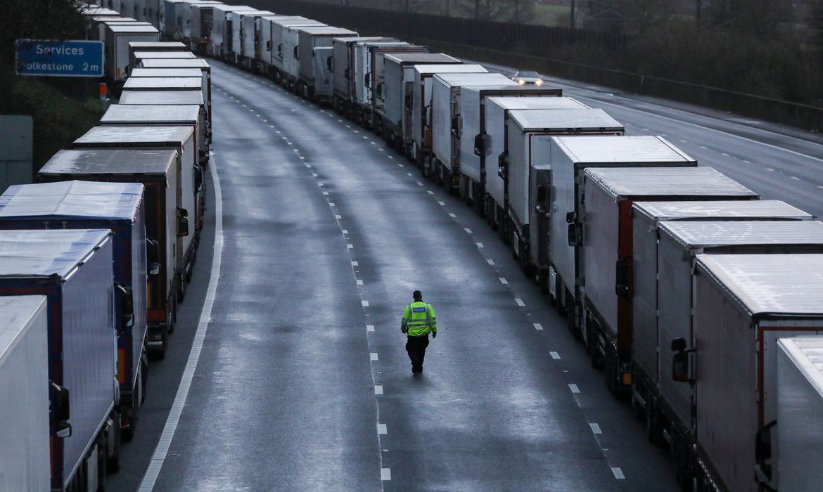 A man walks past lorries parked on the M20 motorway, as EU countries impose a travel ban from the UK following the coronavirus disease (COVID-19) outbreak, near Ashford, Britain, December 22, 2020. REUTERS/Simon Dawson