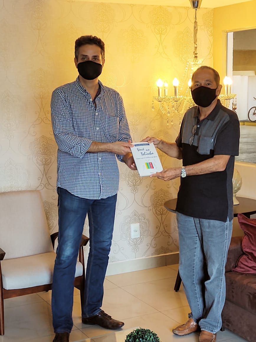 O Nelson Freire recebe o livro do jornalista Heródoto Barbeiro nos seus 10 anos de Programas Ponto de Vista na Band Natal, das mãos de Francisco José.