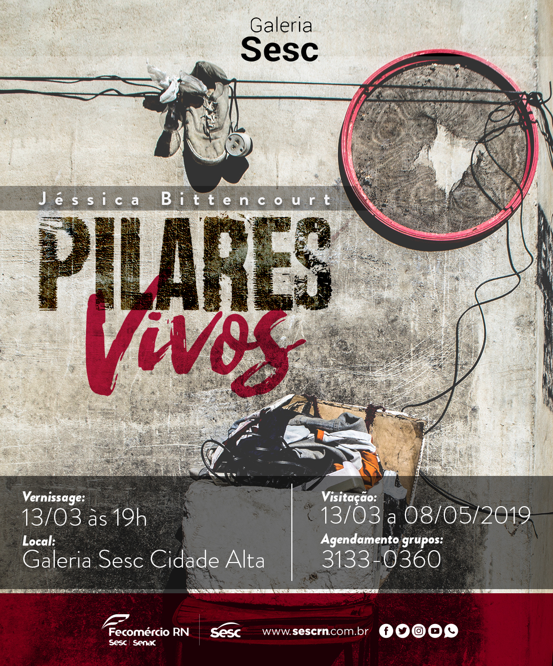 A segunda exposição do ano na Galeria Sesc, Pilares Vivos, da arquiteta e fotógrafa Jéssica Bittencourt, apresenta um pouco da realidade dos moradores dos pilares da Ponte Newton Navarro. A mostra conta com 15 fotos do local e também contará com recursos interativos, com áudios de depoimentos dos moradores e o barulho do impacto dos carros na ponte que ecoam dentro dos pilares, como também o ambiente escuro que remete a atmosfera sombria e solitária do local. A vernissage acontece nesta quarta-feira, 13 de março, às 19h, e é uma iniciativa de incentivo artístico e cultural do Serviço Social do Comércio do Rio Grande do Norte (Sesc RN), instituição do Sistema Fecomércio.