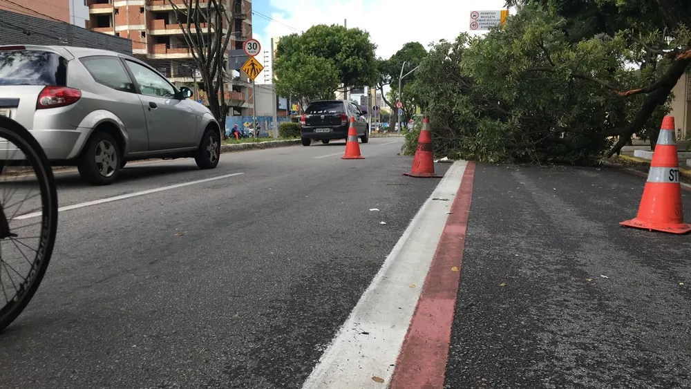 Uma equipe da Secretaria Municipal de Serviços Urbanos (Semsur) esteve no local e tirou o galho da via por volta das 7h40. Porém, até a última atualização desta matéria uma das pistas continuava interditada.