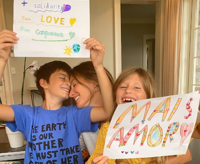 A modelo publicou uma foto ao lado dos filhos, Vivian e Benjamin, com cartazes pregando a solidariedade, e incentivou seus seguidores a seguir o exemplo de doar.