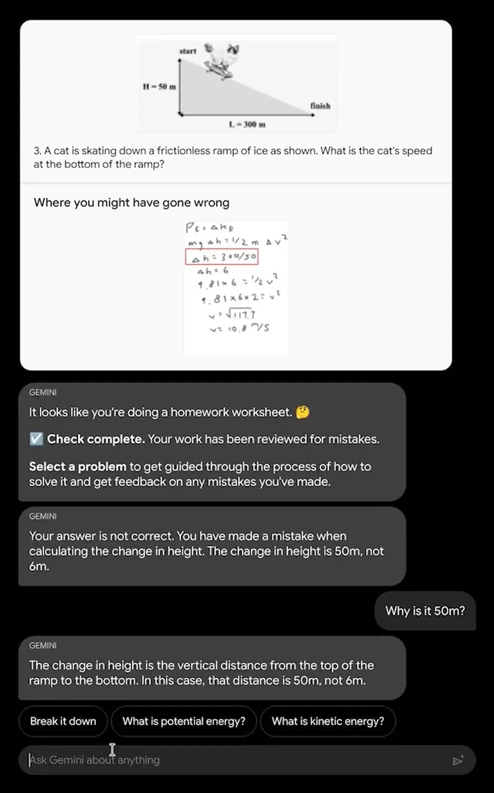 Em uma demonstração, o Gemini conseguiu analisar a foto de um exercício de física e identificar um erro no cálculo. A IA foi capaz de apresentar a solução correta e criar problemas semelhantes para o usuário tentar resolver.