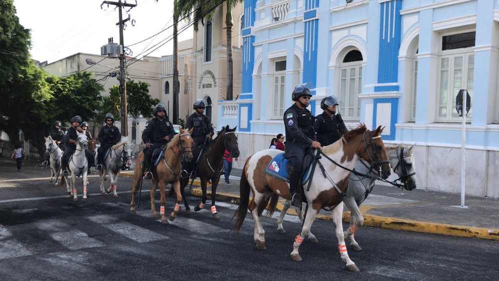 Também com o objetivo de garantir a tranquilidade e segurança, policiais a cavalo fazem ronda no entorno da Assembleia. Também até às 7h30, cerca de 30 manifestantes circulavam pela praça 7 de Setembro, que fica em frente à Assembleia.