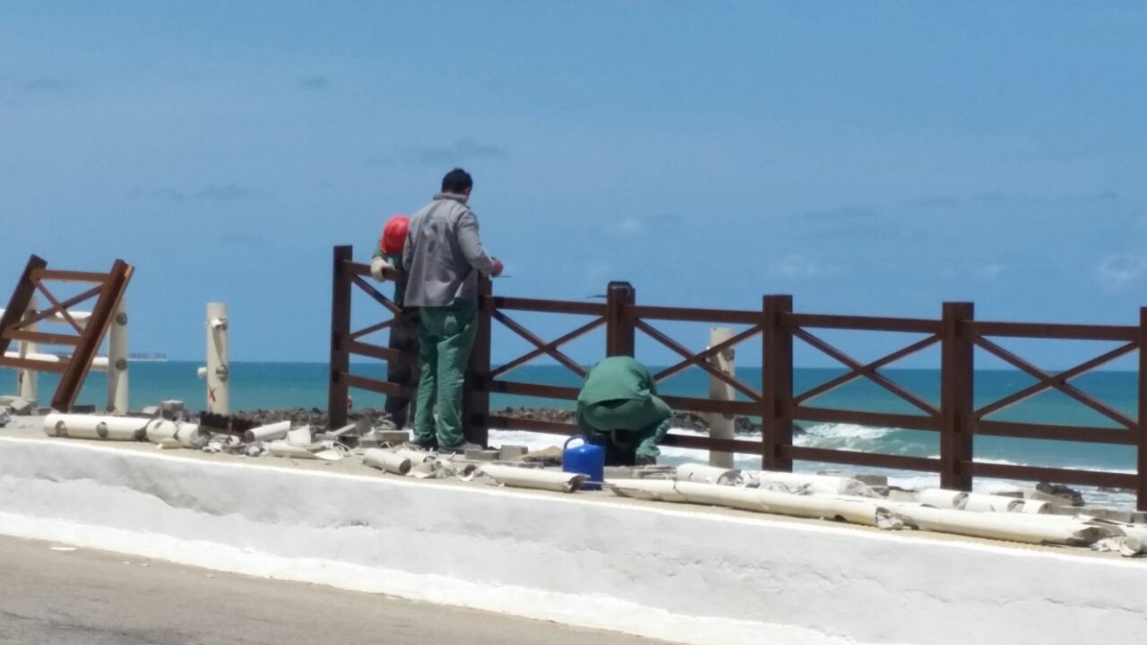 Os novos guarda corpos de madeira envernizada estão sendo colocados na avenida Governador Silvio Pedroza, em Areia Preta. Antes eles já estavam sendo instalados na Praia do Meio e a população está aprovando esse novo modelo (foto)