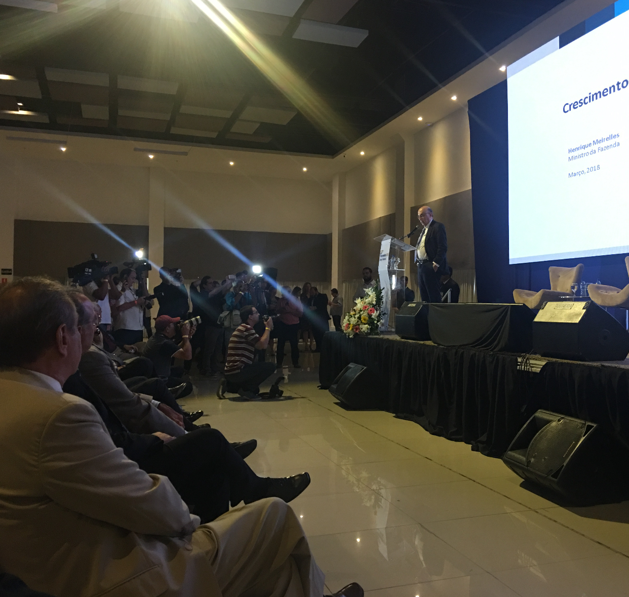 O ministro falou sobre tema Desenvolvimento e Reformas, e mostrou muitos dados economicos do país, afirmando que o Brasil saiu da pior recessão da sua história. Para ele, a recessão que o Brasil vivenciou nesses ultimos dois anos superou a de 1930, quando o país passou por sérios problemas decorrentes do crash da Bolsa americana, em 29. Naquela ocasião, o governo teve de adotar medidas drásticas, inclusive a de queimar alguns produtos da pauta de exportação brasileira, como por exemplo o café, por falta de preço no mercado internacional.