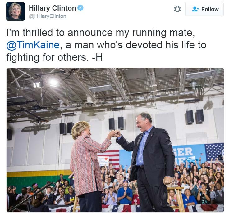 “Estou animada de anunciar @timkaine como meu companheiro de chapa, um homem que dedicou sua vida a lutar pelos outros”, tuitou a ex-secretária de Estado e virtual candidata democrata à presidência dos Estados Unidos.