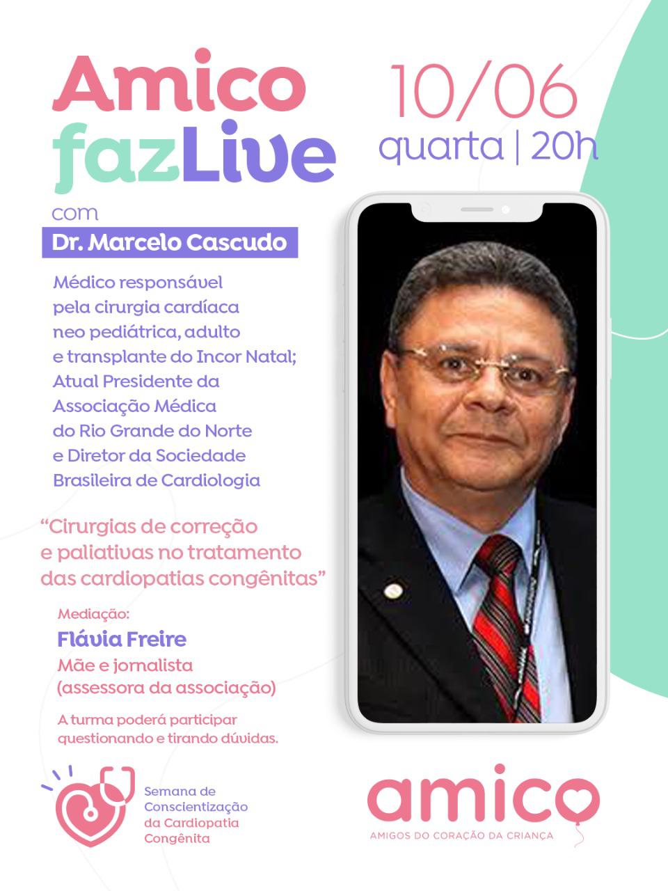 Hoje (10), às 20h, vai rolar um bate-papo com o cirurgião Marcelo Cascudo, responsável pelas cirurgias cardíacas neo-pediátrica, adulto e transplante do Incor Natal e também um dos fundadores de nossa AMICO.