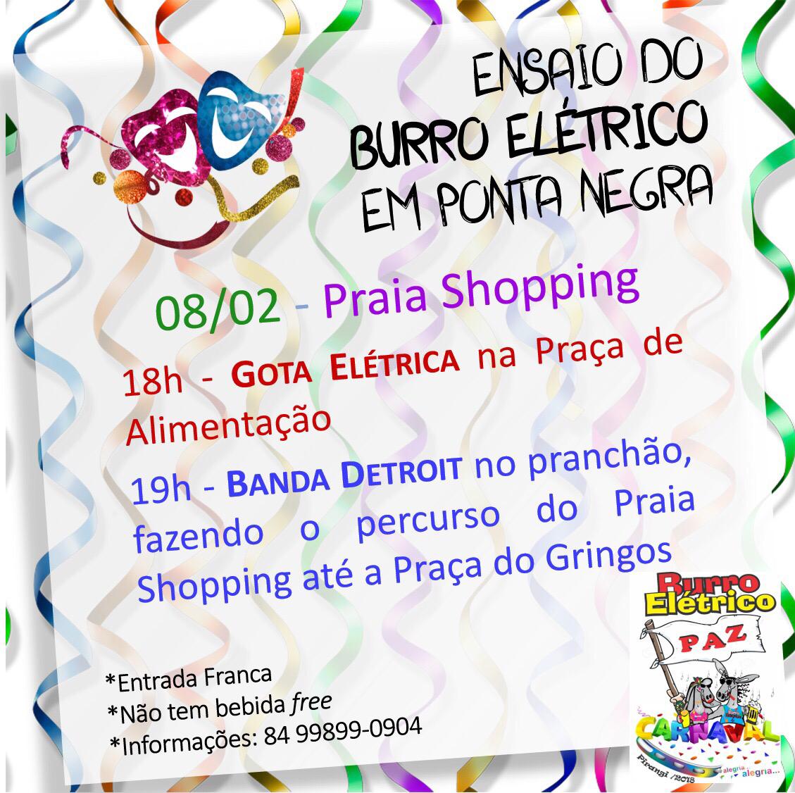 Hoje é dia do ensaio do Burro Elétrico no Praia Shopping, no bairro de Ponta Negra. A partir das 18h tem a banda Gota Elétrica, na Praça de Alimentação e às 19h, a banda Detroit no pranchão, fazendo o percurso do Praia Shopping à praça do Gringos. A entrada é franca!