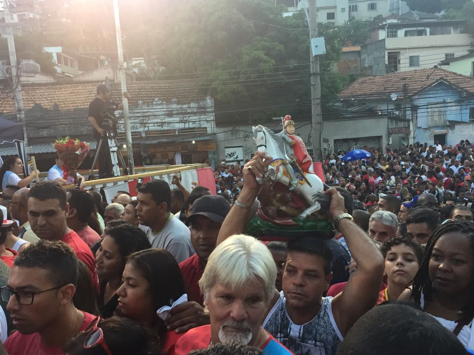 São Jorge, o santo guerreiro, recebe homenagem de adeptos de vários cultos. Para os católicos, São Jorge representa a força de Deus na luta dos excluídos e marginalizados. Para os adeptos das religiões afro-brasileiras no Rio de Janeiro, ele é a representação do orixá Ogum, o guerreiro que protege as almas contra o demônio.