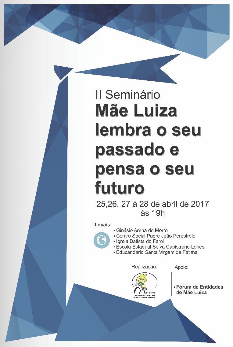 Nesta sexta-feira (28), ocorre o encerramento do “II Seminário Mãe Luiza lembra o seu passado e pensa o seu futuro” que será realizado no Ginásio Arena do Morro. Na programação temos: apresentaçaõ das propostas e sínteses do debate; palestra com o arquiteto Tomislav Dushanov, com a proposta Mãe Luiza à luz da obra “Visão sobre Mãe Luiza”; apresentação dos jovens da Escola de Música de Mãe Luiza e Escola Dinarte Mariz.