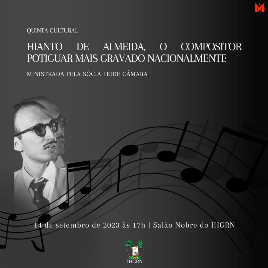 Hoje (14), na Quinta Cultural do IHGRN, Leide Câmara ministrará uma palestra sobre o compositor Hianto de Almeida, às 17h no Salão Nobre do Instituto Histórico e Geográfico do Rio Grande do Norte.