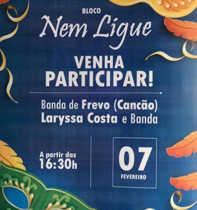 O carnaval natalense este ano está de vento em poupa. Os blocos vem animando as prévias carnavalescas em varios locais, desde o início da semana. Hoje por exemplo é a vez, dentre outros, do Nem Ligue, que tem a concentração no Letra e Musica, a conhecida confraria do ARY, em frente a UNP da rua Floriano Peixoto.
