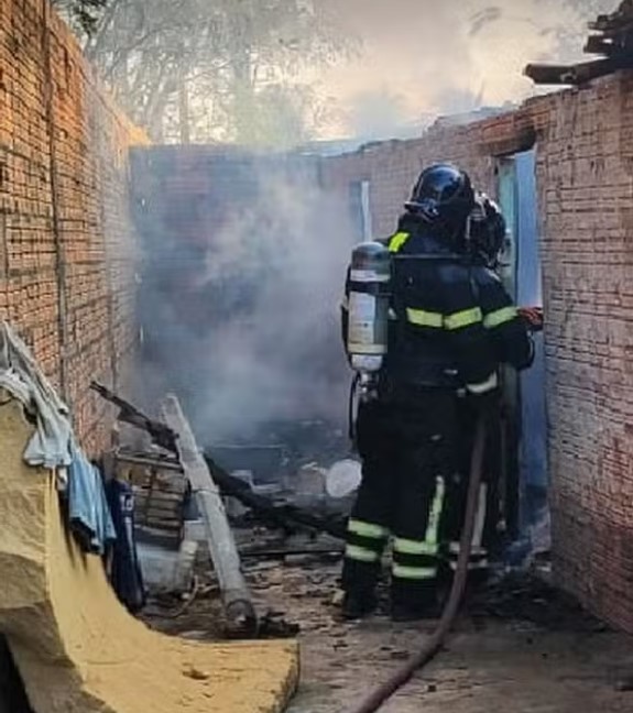 O fogo destruiu grande parte do imóvel e dificultou a atuação inicial dos Bombeiros, que trabalharam para controlar as chamas e impedir que o incêndio se alastrasse para residências vizinhas.