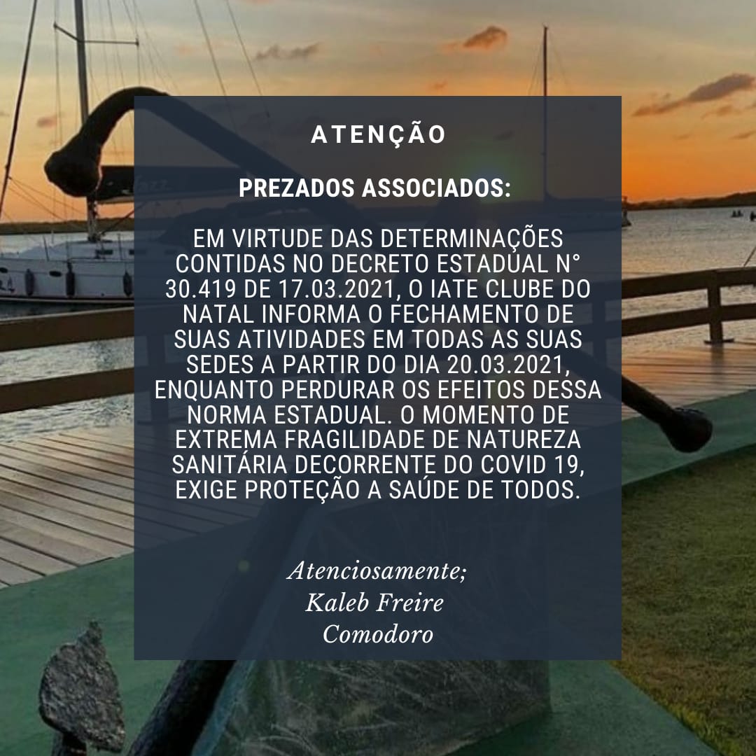 Cumprindo o decreto estadual, o Iate Clube do Natal informa o fechamento de todas as suas sedes a partir do deste sábado (20), até enquanto perdurar os efeitos da norma estadual.