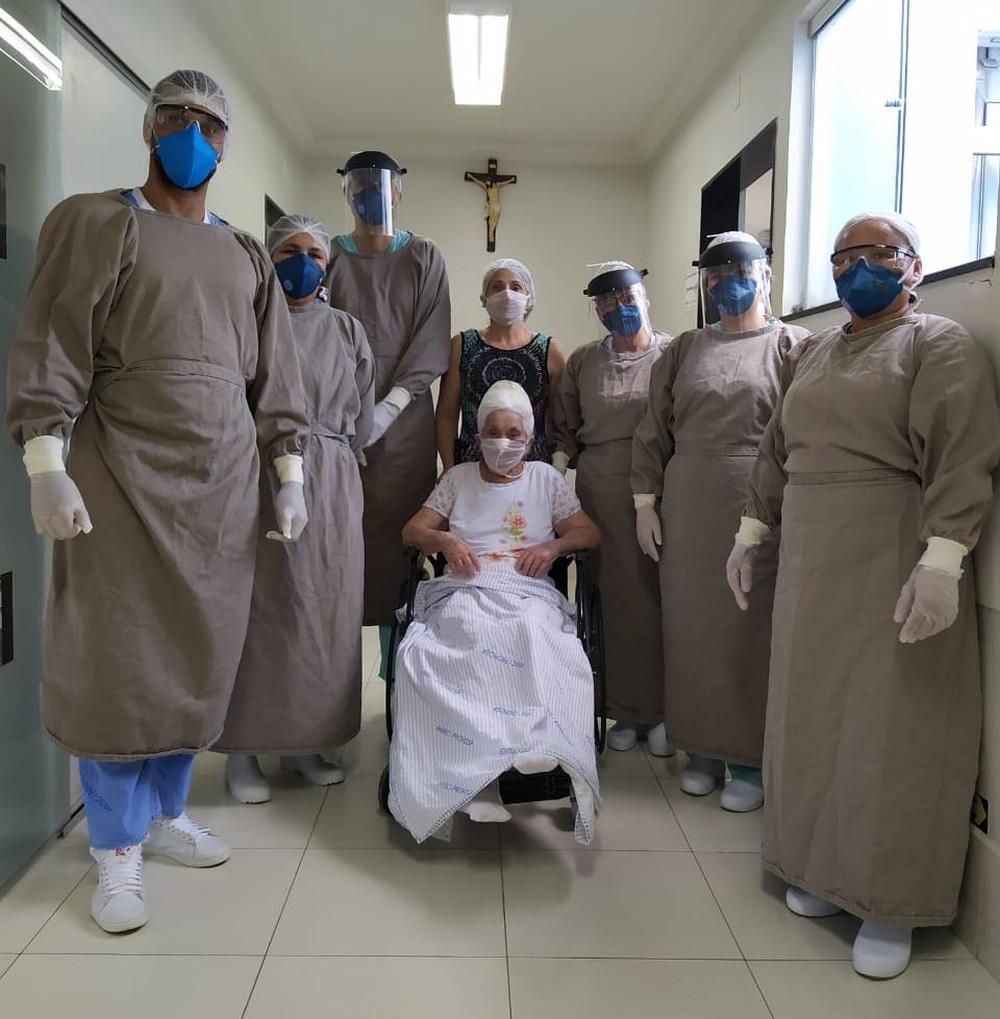 Além de ser do grupo de risco da doença, por causa da idade, a paciente tem alzheimer. Carlinda ficou internada, mas não precisou ir para o Centro de Tratamento e Terapia Intensivo (CTI). Ao sair da unidade recebeu o carinho dos colaboradores da instituição.
