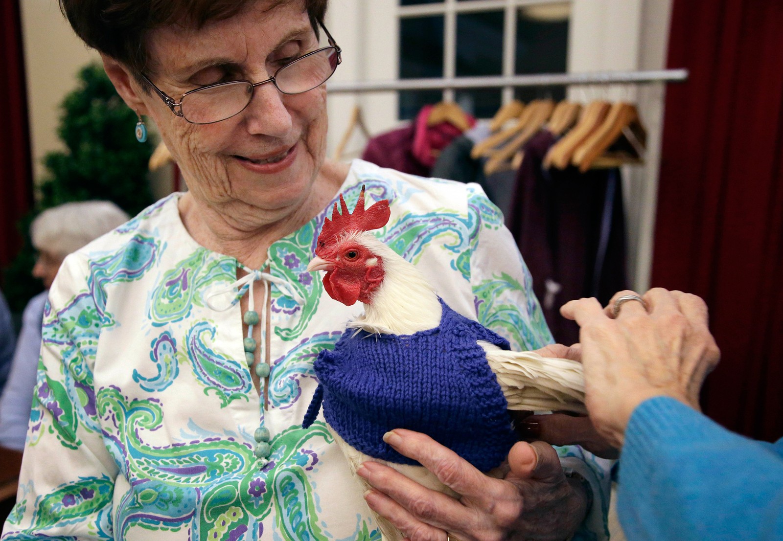 Um grupo de aposentadas de uma casa de repouso de Milton, subúrbio de Boston, está tricotando suéteres para aquecer galinhas de uma propriedade vizinha durante o inverno na Nova Inglaterra.