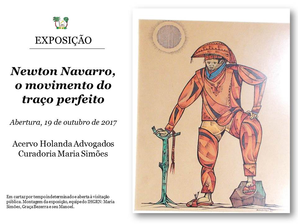 A diretoria do IHGRN Convida todos para a Vernissage da exposição de telas de Newton Navarro, pertencentes ao acervo de “Holanda Advogados”, com curadoria de Maria Simões, que ocorrerá quinta-feira (19), às 18 horas, na sala de exposição Dorian Gray Caldas, deste Instituto.  Na oportunidade, haverá o lançamento da Revista do IHGRN, número 95, Edição comemorativa aos 150 anos de Manoel Dantas, que será vendida à importância de R$ 30,00 (trinta reais).