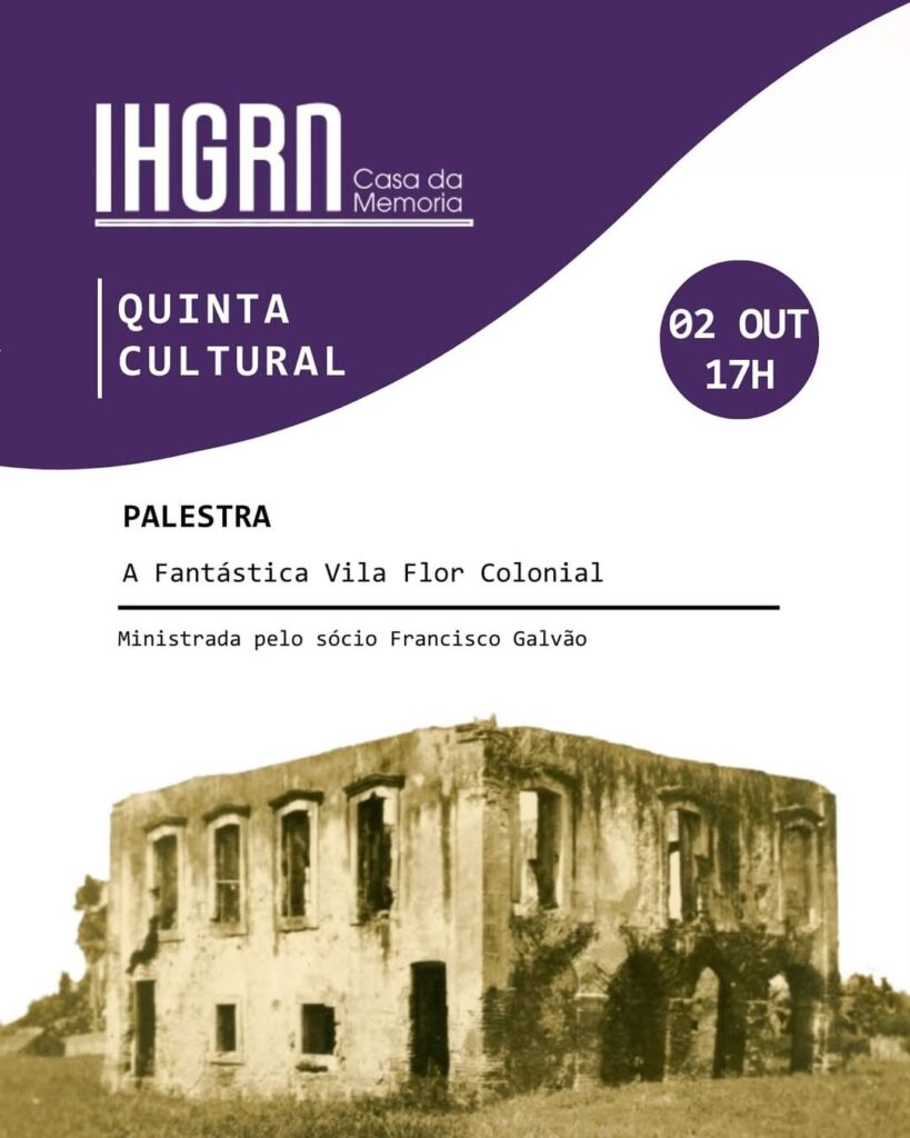 O IHGRN realiza a primeira edição de outubro da Quinta Cultural nesta quinta (02/10), às 17h, no Salão Nobre, com a palestra “A fantástica Vila Flor colonial”, ministrada pelo sócio efetivo Francisco Alves Galvão Neto, historiador, pedagogo e gestor de cultura. A exposição abordará o período colonial da antiga aldeia indígena de Gramació, origem do atual município de Vila Flor, no leste potiguar, cujo nome remete à vila homônima em Portugal. O evento é gratuito e aberto ao público, com capacidade para 50 pessoas.