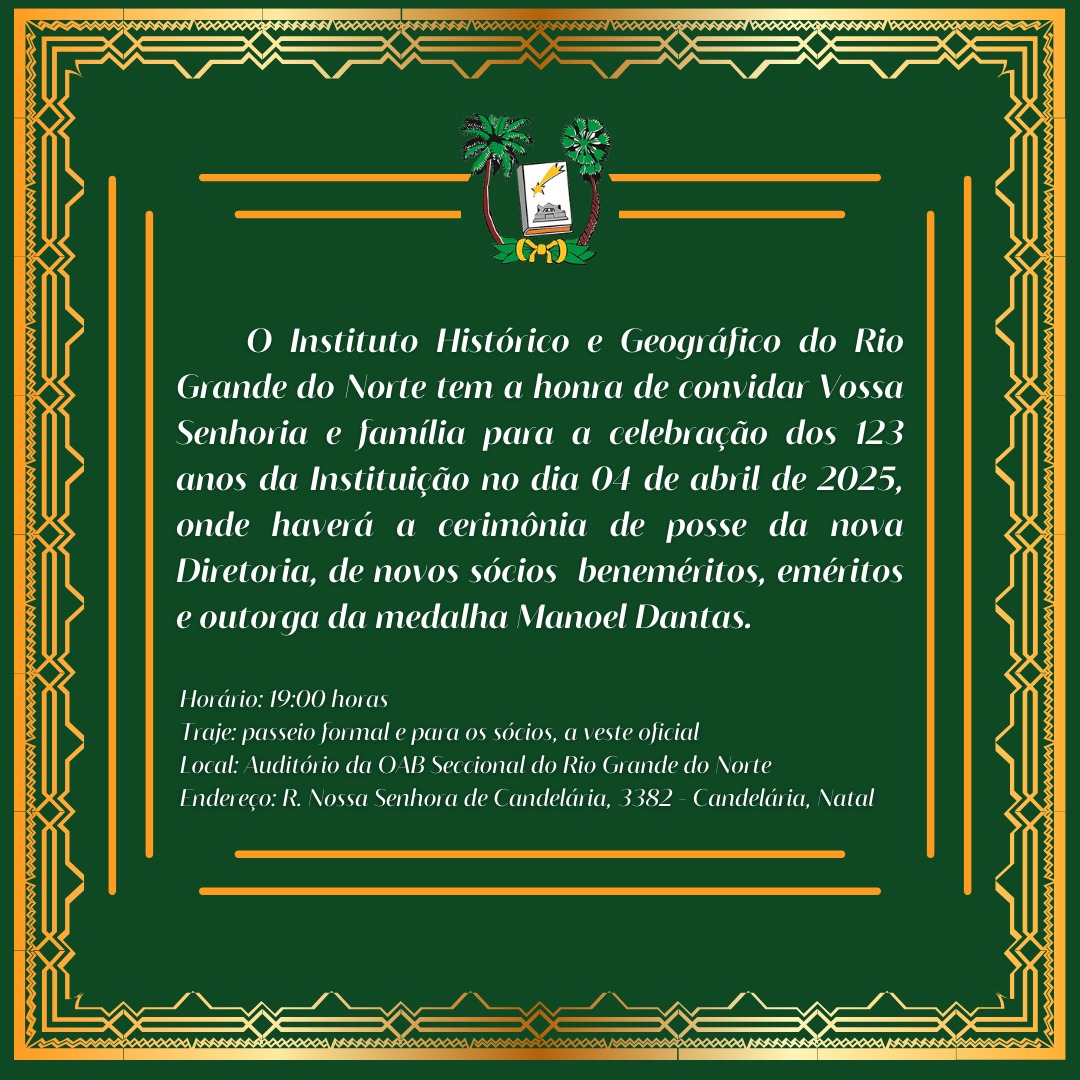 O Instituto Histórico Geográfico do Rio Grande do Norte (IHGRN) terá a posse da nova diretoria dia 4 de abril, às 19h no Auditório da OAB Seccional do Rio Grande do Norte, na R. Nossa Senhora de Candelária, nº 382, no bairro de Candelária.