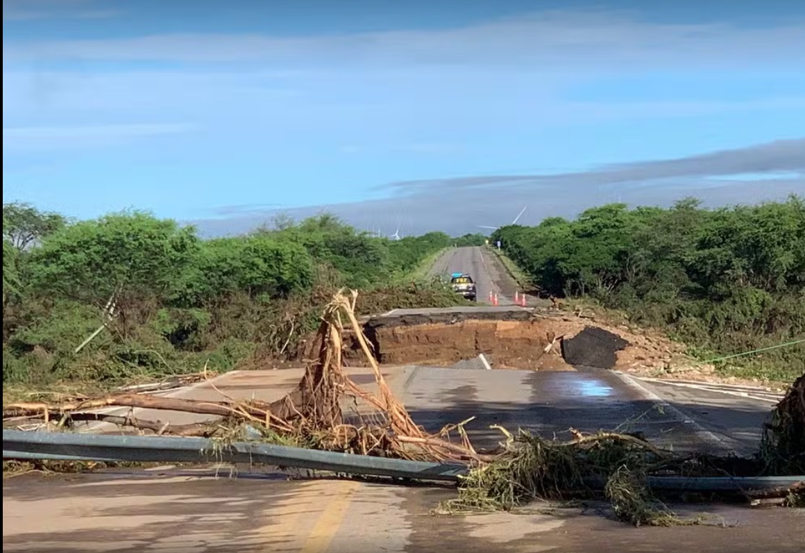Na manhã desta segunda-feira (1), a Polícia Rodoviária Federal também informou a interdição de uma faixa na BR-405, no sentido de Apodi a Mossoró, devido a uma erosão na base da pista, em consequência do rompimento de um açude. Apesar do fluxo mais lento no local, o trânsito flui nos dois sentidos, segundo a corporação.