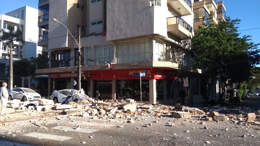 O prédio, onde moram 16 famílias, fica na Avenida Independência. O térreo é ocupado por salas comerciais. Um carro que estava estacionado ao lado do prédio foi atingido por escombros e ficou completamente destruído.