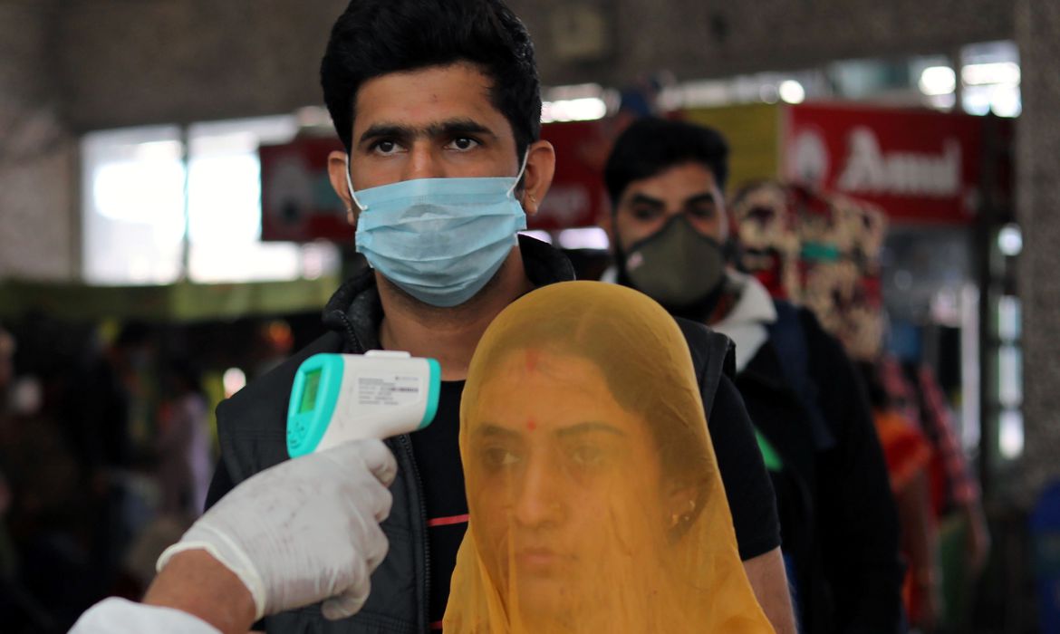 Um trabalhador de saúde em equipamentos de proteção individual (EPI) verifica a temperatura dos passageiros em meio à propagação da doença coronavírus (COVID-19), em uma estação ferroviária em Mumbai, Índia, 19 de dezembro de 2020. REUTERS / Francis Mascarenhas