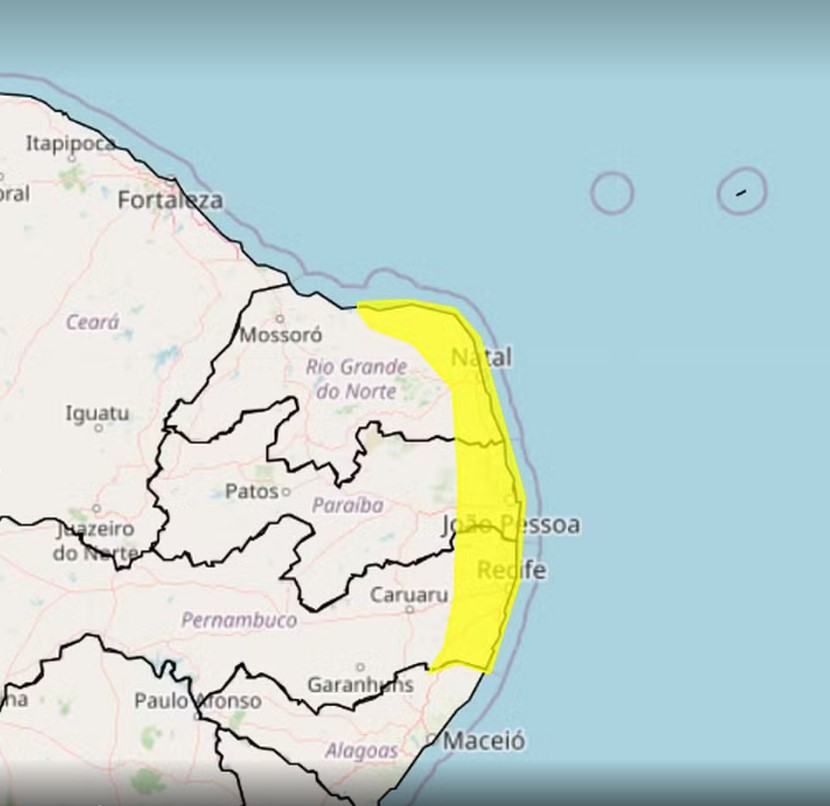 O Instituto Nacional de Meteorologia (Inmet) emitiu um alerta de chuvas intensas de até 50 milímetros para Natal e outras 50 cidades do Rio Grande do Norte.