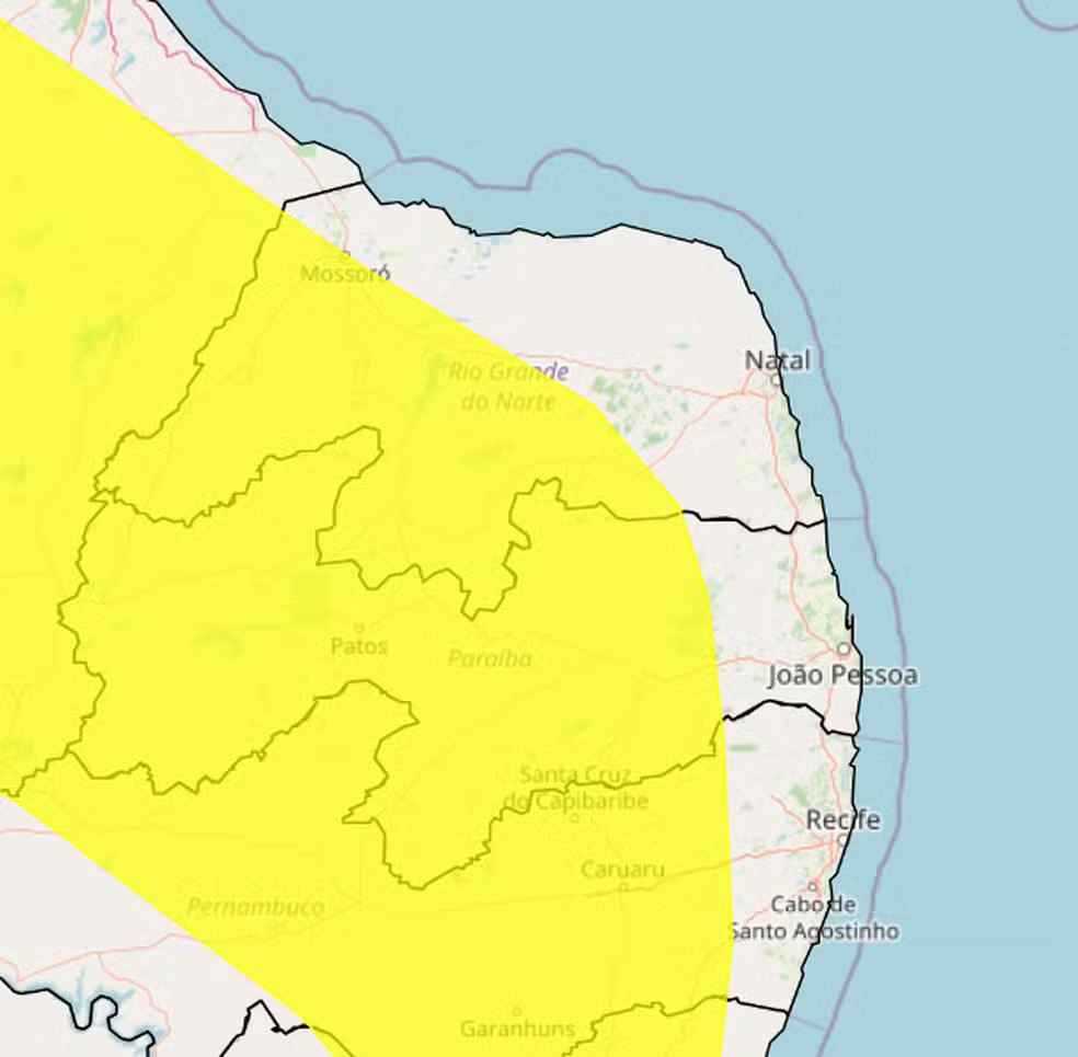O alerta é da cor amarela, que representa perigo potencial – os outros dois níveis no grau de severidade são cor laranja (perigo) e vermelho (grande perigo).