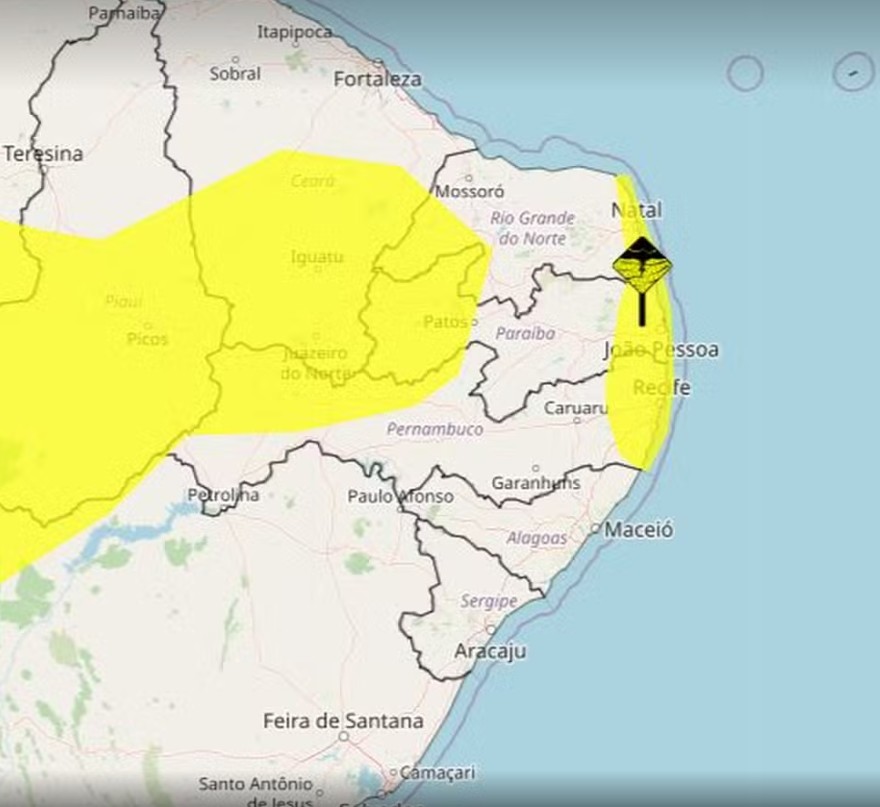 O Instituto Nacional de Meteorologia (Inmet) emitiu dois alertas de chuvas intensas para o Rio Grande do Norte. Um deles é para o chamado Litoral Oriental, que vai da praia de Baía Formosa até Touros, incluindo a capital Natal, e o o outro é para parte do Alto Oeste, Região Central e Seridó.