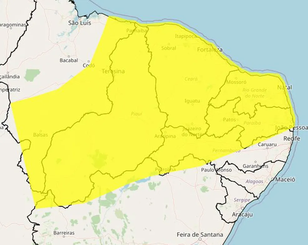 O aviso é de perigo potencial (amarelo), o primeiro na escala de três graus de severidade. (Entenda as diferenças no grau de severidade abaixo).