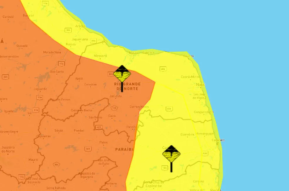 Um alerta laranja, de perigo, abrange 83 cidades das regiões Oeste, Central e Seridó. Outros dois alertas são amarelos e abrangem todo o litoral e demais regiões do estado.