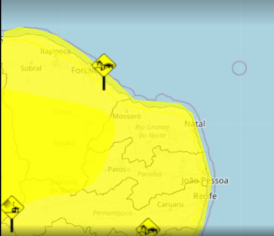O Instituto Nacional de Meteorologia (Inmet) emitiu alertas vendaval e ventos costeiros que englobam todo o Rio Grande do Norte, além de um alerta de baixa umidade que atinge a Região Alto Oeste.