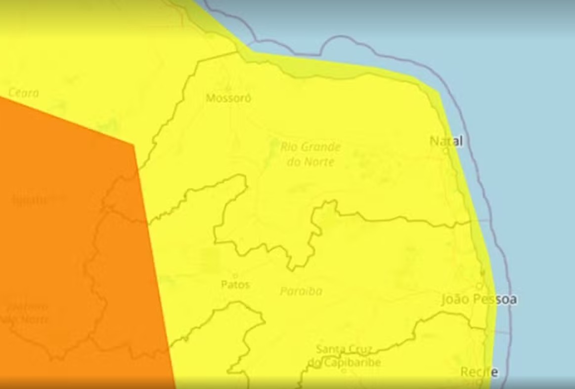 O alerta laranja, de perigo, abrange apenas 16 municípios da região do Alto Oeste potiguar, das 12h desta segunda (13) até às 10h de terça (14).