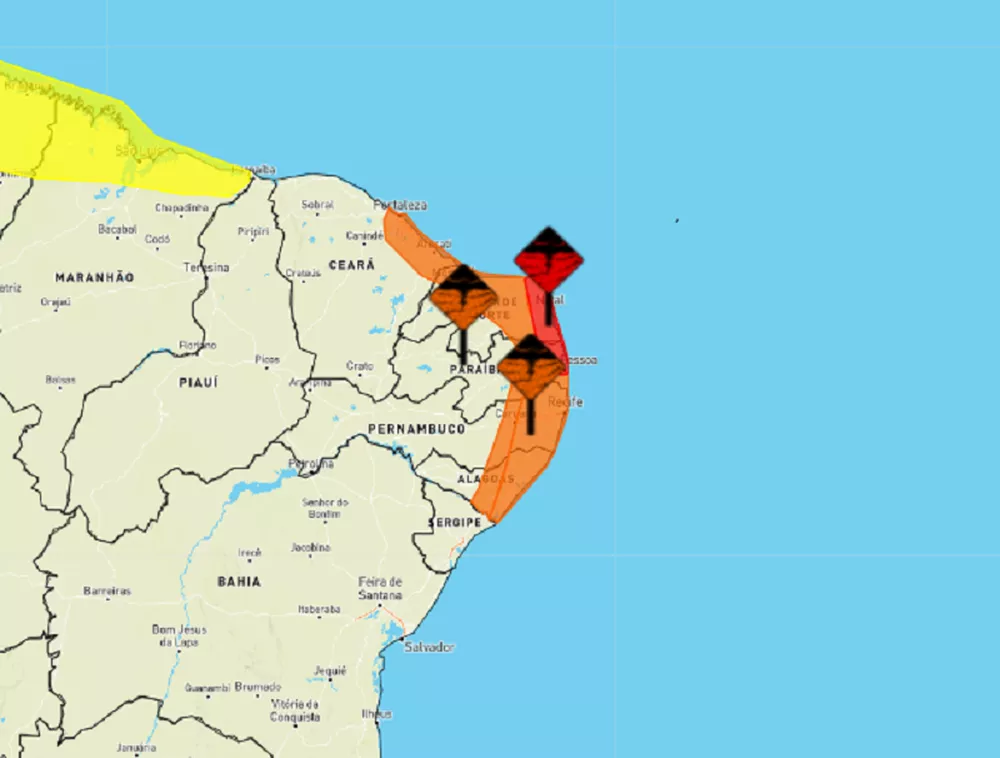 O Instituto Nacional de Meteorologia (Inmet) emitiu um alerta de chuvas intensas, com classificação vermelha – de grande perigo – para 44 municípios do Litoral do Rio Grande do Norte, além de cidades da Paraíba. O aviso vale das 10h desta sexta-feira (27) até às 10h do sábado (28).