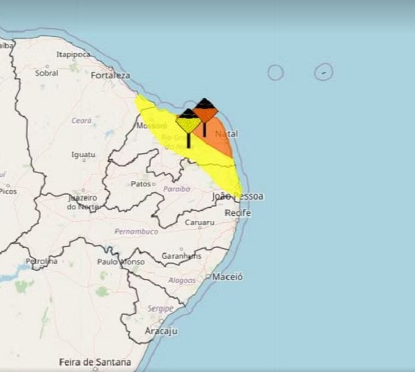 O alerta laranja publicado pelo Inmet para o RN prevê chuva entre 30 a 60 mm/h ou 50 a 100 mm por dia. O aviso alerta para risco de alagamentos, deslizamentos de encostas, transbordamentos de rios, em cidades com tais áreas de risco. Natal está entre as cidades desse alerta, que vale até 10h de segunda-feira (17).