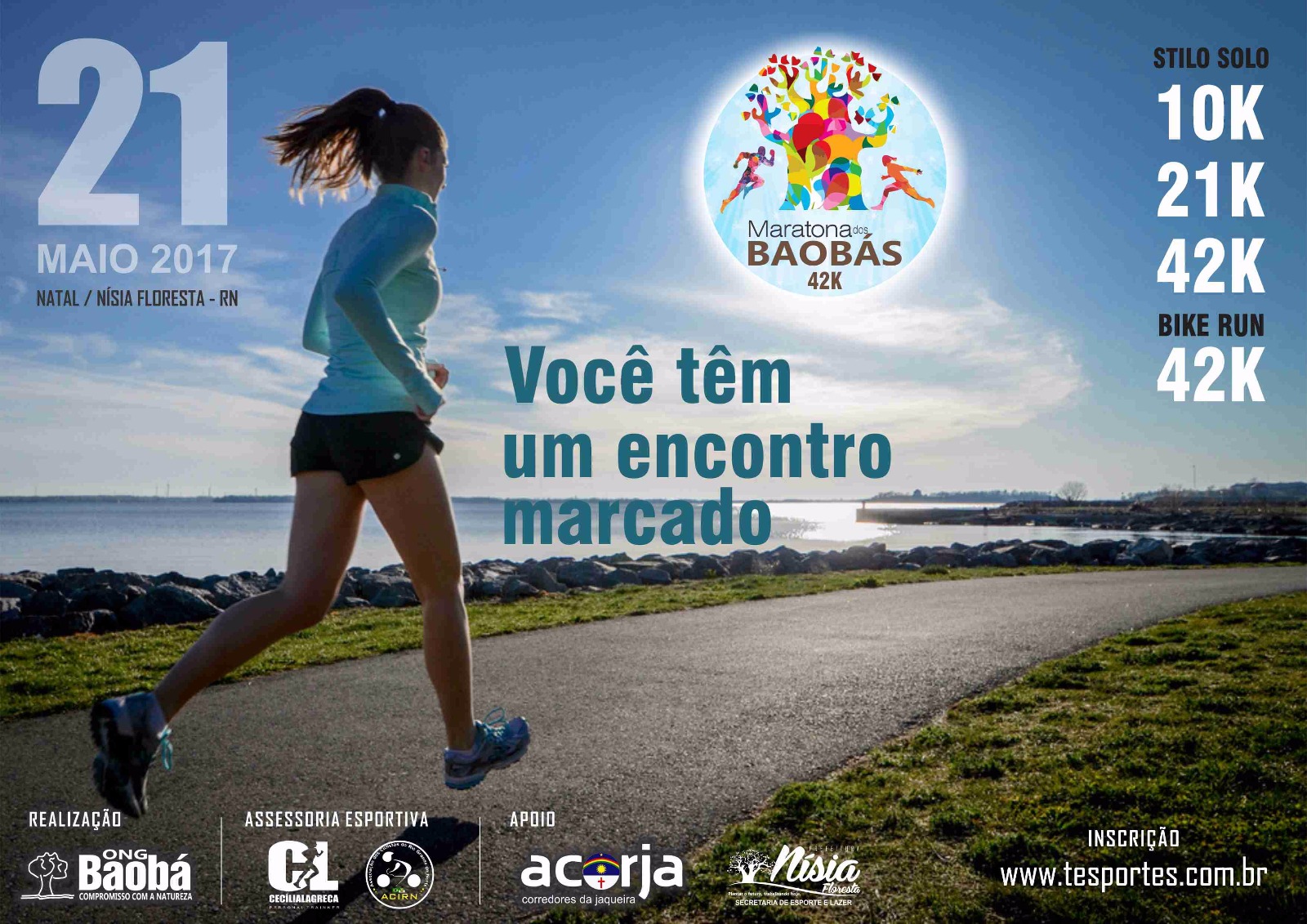 A Maratona dos Baobás, será dia 21 de maio de 2017, domingo, em Natal, com a concentração às 4h30, a fotografia oficial do evento às 4h45, terá a assinatura do fotojornalista Canindé Soares. As inscrições para a Maratona dos Baobás são realizadas exclusivamente pelo site www.tesportes.com. O atleta estará inscrito após o pagamento da taxa de R$ 75,00 (setenta e cinco reais), até o dia 11 de abril de 2017, após esta data, o valor da inscrição passará a valer R$ 90,00 (noventa reais), onde já estão inclusos as taxas de conveniência do site e o seguro individual por atleta, e ou finalizar o limite de vagas. Será aceita a inscrição, do atleta com idade mínima de 18 anos, completados até o dia 20 de maio de 2017, da realização do congresso técnico.