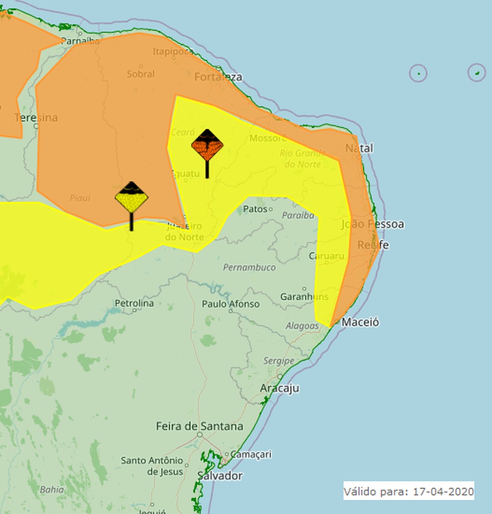 Mesmo os municípios potiguares que não estão sob o aviso de alerta de perigo, devem ficar sob atenção, porque estão no aviso de alerta potencial, emitido também pelo instituto e válido pelo mesmo prazo, até às 11h deste sábado.