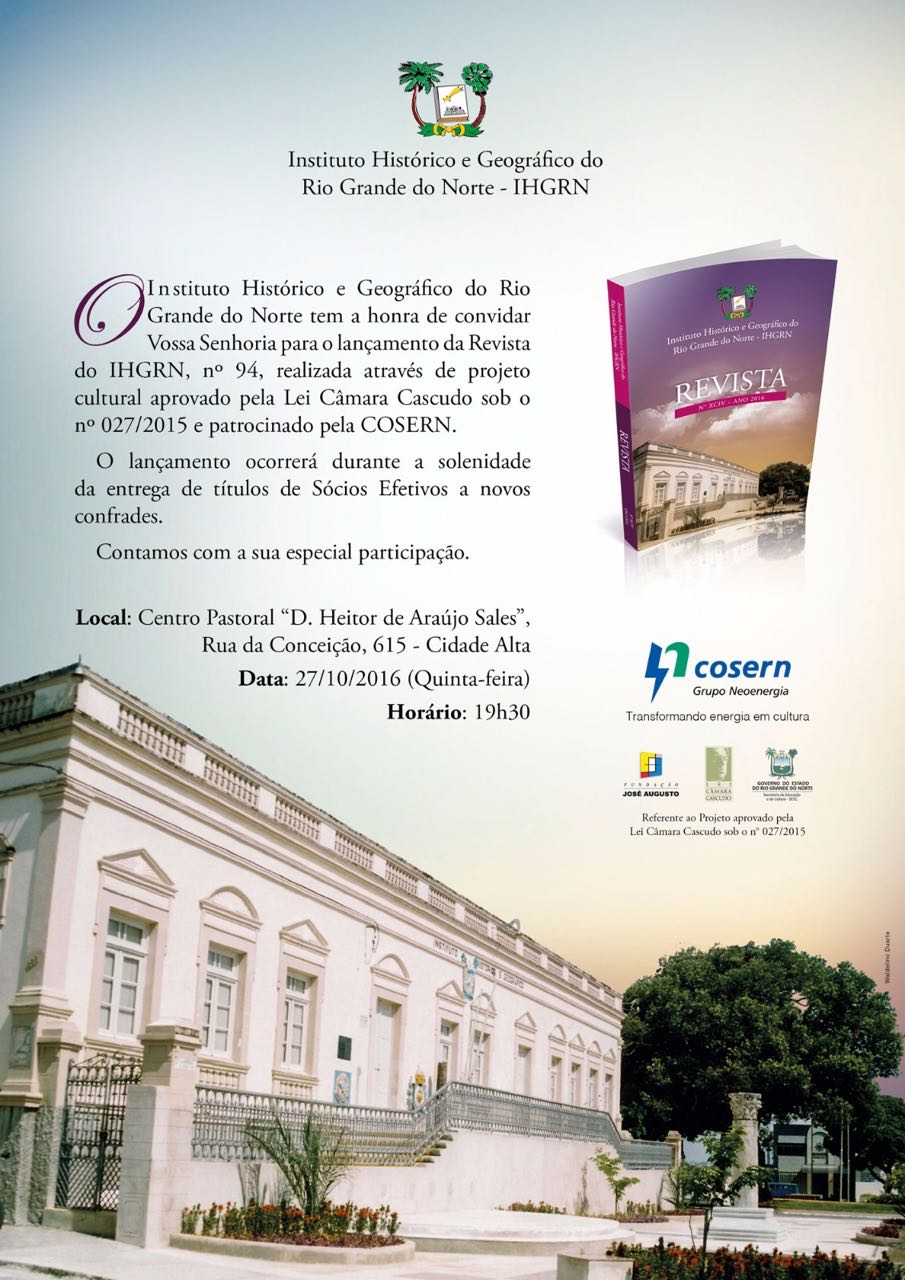 Instituto Histórico e Geográfico do RN lança a Revista do IHGRN nesta quinta-feira (27) às 19h30 no Centro Pastoral D. Heitor de Araújo Sales, na Cidade Alta.