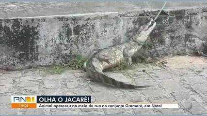 Um jacaré foi encontrado caminhando pelas ruas do bairro Gramoré, na Zona Norte de Natal. O animal andava pelas ruas de paralelepípedo da localidade e chamou a atenção de quem passava pelo trecho. Alguns registraram o momento em vídeo.