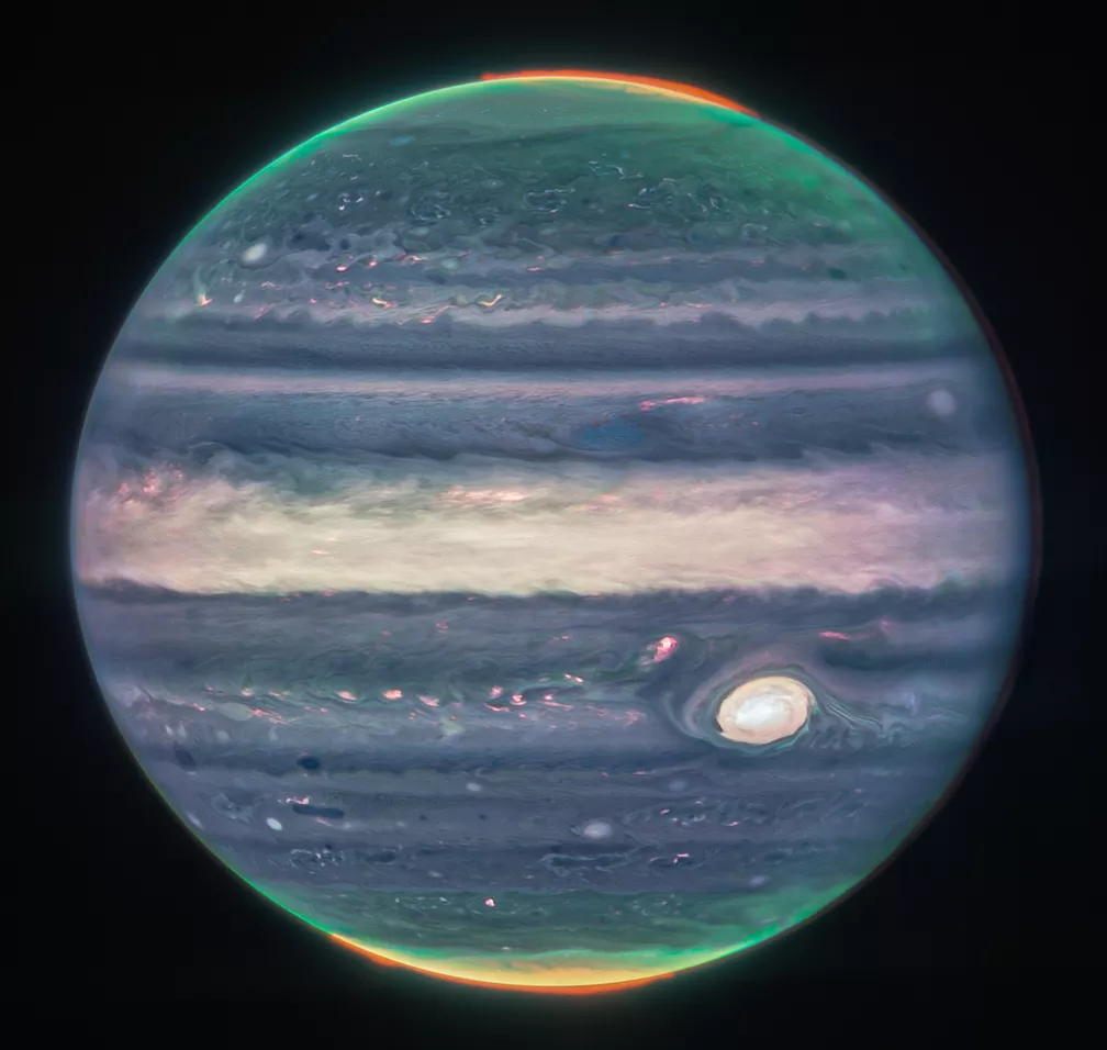 O telescópio espacial internacional James Webb capturou novas fotos de Júpiter, o maior planeta do Sistema Solar. As imagens foram divulgadas pela Nasa, a agência espacial norte-americana, na manhã desta segunda-feira (22).