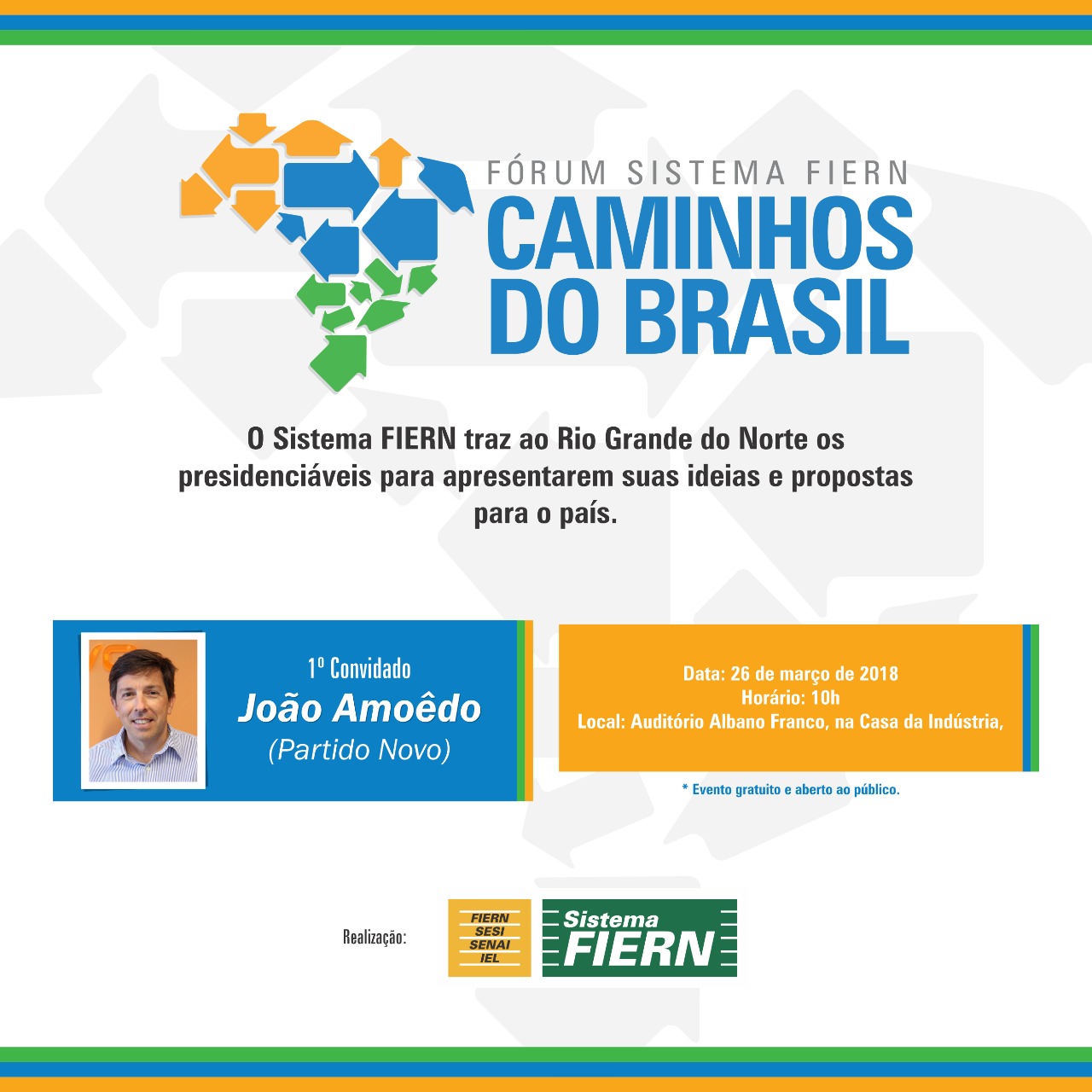 Nesta segunda feira acontece a primeira edição do Fórum Sistema FIERN Caminhos do Brasil. O primeiro participante será o presidenciável João Amoedo, presidente do Partido Novo. O evento acontecerá às 10h, no Auditório da Fiern.