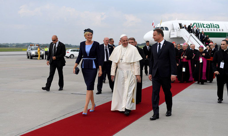 O Pontífice foi recebido pelo Presidente polonês, Andrzej Duda, acompanhado pela esposa. Não houve discurso no Aeroporto, mas uma acolhida oficial e informal, numa cerimônia em que foram entoados os hinos dos dois Estados e apresentadas as respectivas delegações.