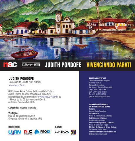 Do dia 06 a 26 de setembro estará acontecendo em Natal a exposição da pintora potiguar Judith Pondofe, na Galaeria Conviv’Art, da UFRN. Sobre ela diz Vicente Vitoriano, seu curador: