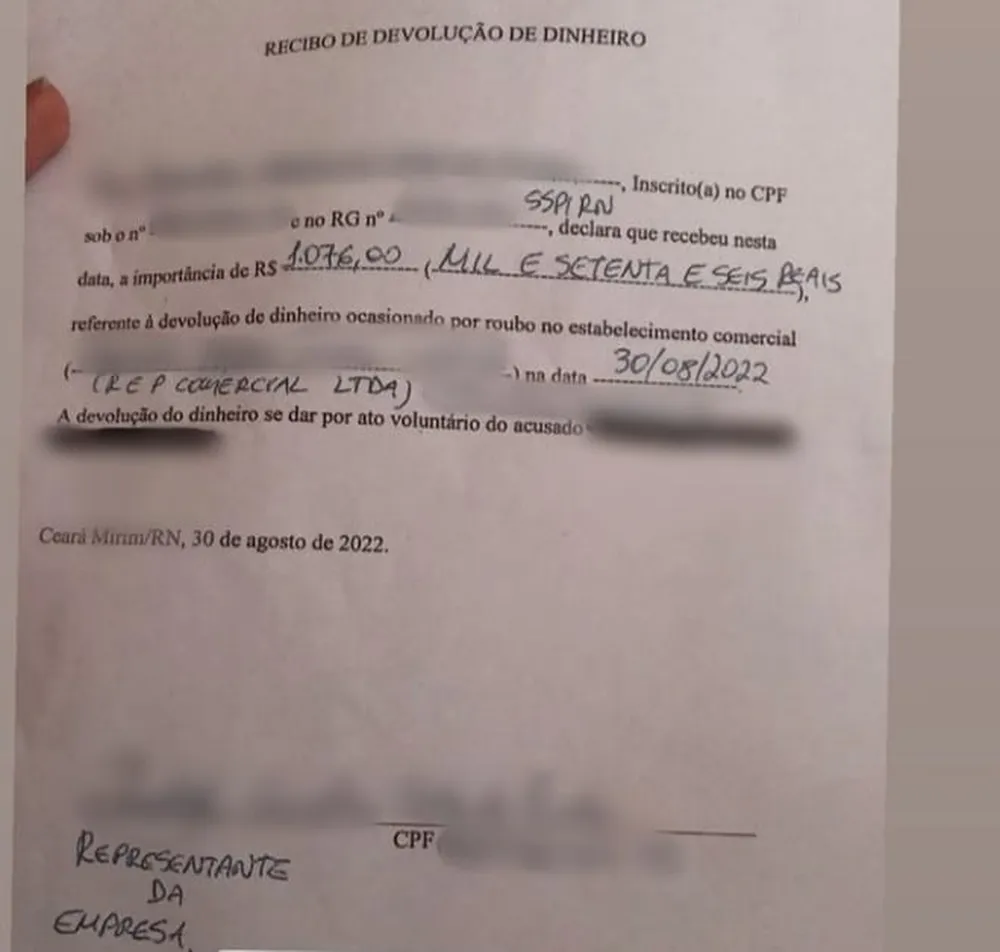 A Polícia Civil confirmou que o valor roubado foi devolvido integralmente. Ainda de acordo com a corporação, o recibo não possui validade jurídica para isentar o suspeito do crime, mas pode servir como uma circunstância de atenuação da pena, a critério do judiciário.