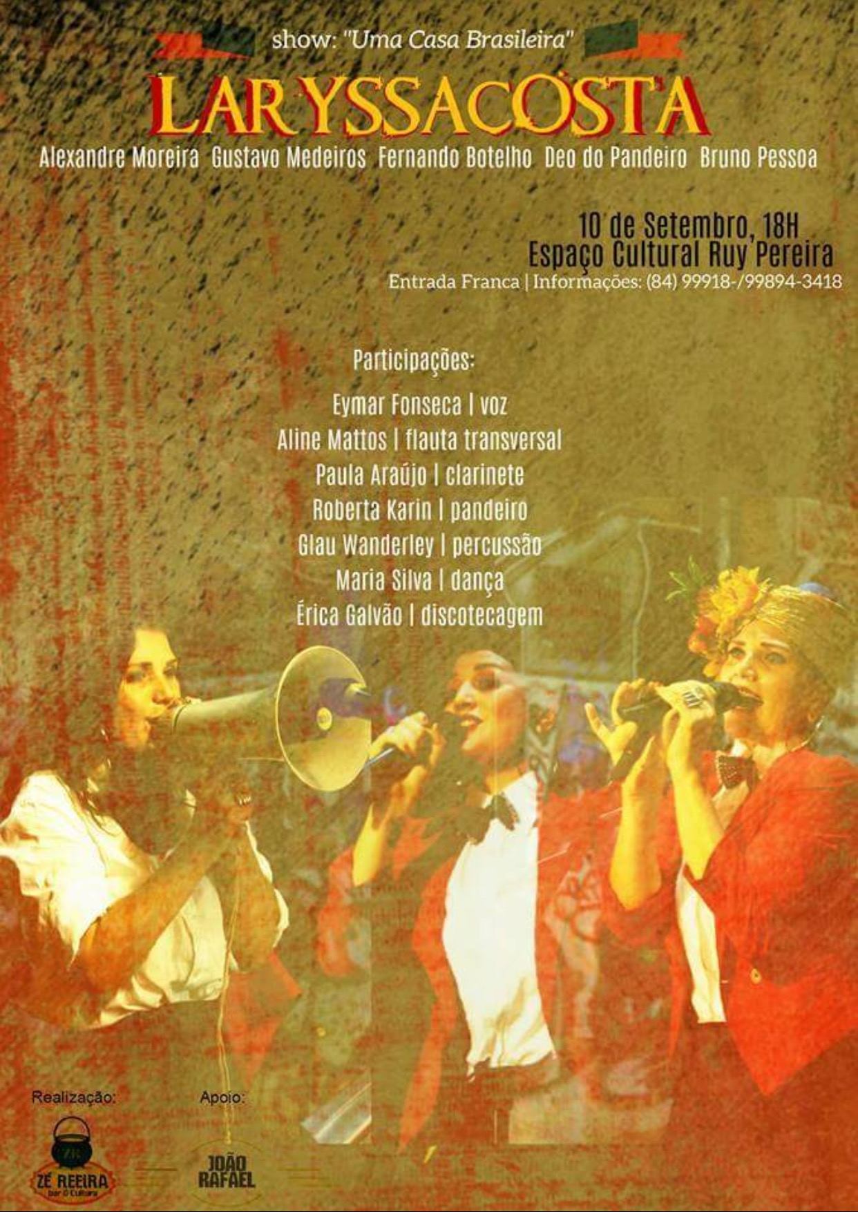 “Um show que transita entre o tradicional e o moderno, o antigo e o contemporâneo, que flerta com o mambembe e o nostálgico, uma mistura de ritmos e gêneros que formam a diversidade da música popular do Brasil”. Assim é definido “Uma Casa Brasileira”, o novo show da cantora Laryssa Costa que reúne variadas expressões artísticas e leva mais uma vez o seu trabalho para o palco do Espaço Cultural Ruy Pereira, no centro da Cidade Alta. Instrumento de câmara, jogo de pandeiro, contracanto, performances, danças e convidados especiais, são alguns dos atrativos propostos pela cantora. No repertório, músicas tão antigas quanto inéditas. Antigas porque foram compostas nos anos 30, 40. Inéditas porque quase não são reproduzidas, tocadas mais, e aqui são retomadas como se fossem novas, apresentadas com elementos mais atuais, arranjos criativos.