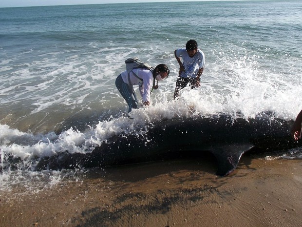 Biólogos que investigam as causas do encalhe coletivo de 30 baleias da espécie falsa-orca acreditam que o líder do grupo estaria doente, desorientado e, assim, teria provocado a ida dos demais até a praia de Upanema, no litoral Norte de Rio Grande do Norte. O encalhe coletivo foi registrado na manhã de domingo (22) em Areia Branca, cidade a 327 quilômetros de Natal. Das 30 baleias que encalharam, sete morreram. As seis primeiras morreram ainda pela manhã. À tarde, uma que havia sido levada para o mar morreu após ser atacada por tubarões. O biólogo disse que já foi coletado material das baleias mortas. Esse material será levado para estudos na UERN. Após a coleta, as baleias foram enterradas na praia de Upanema. Um trator da Prefeitura de Areia Branca foi usado para auxiliar nas escavações e no transporte dos animais.
