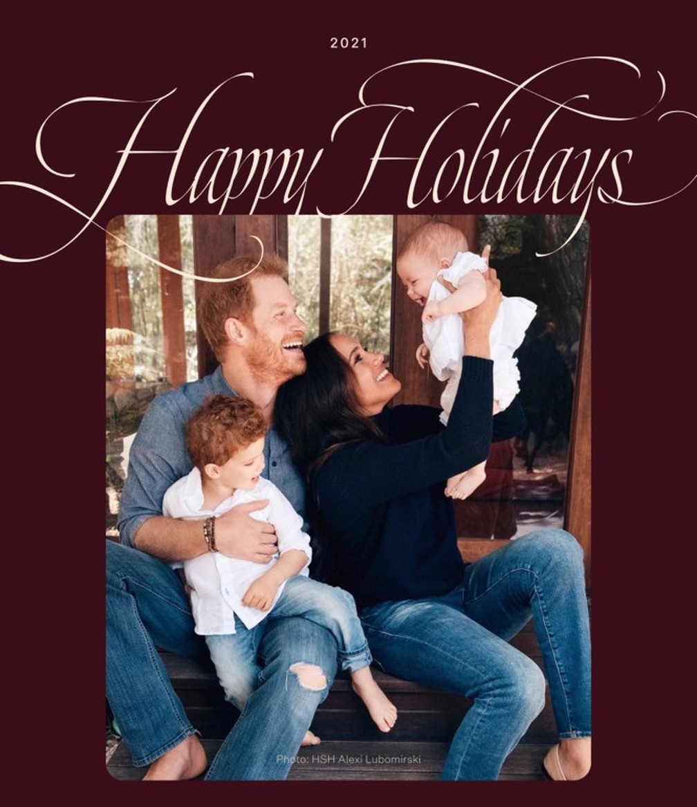 No cartão de Natal da família, Meghan aparece levantando a filha no ar, enquanto Harry está com Archie no colo. Nele está escrito: “Neste ano, 2021, demos boas vindas à nossa filha, Lilibet. Archie nos transformou em mãe e pai, e Lili nos fez virar uma família.”