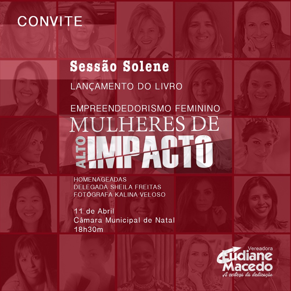 A Câmara Municipal de Natal será a sede do lançamento do livro “Empreendedorismo Feminino – Mulheres de Alto Impacto”, nesta terça-feira (11) às 18h30min. Foram 29 mulheres convidadas do Brasil, Dubai e Moçambique, a fotógrafa Kalina Veloso e a delegada Sheila Freita foram agraciadas com o convite para contar um pouco sobre suas histórias de vida e carreira de sucesso. O evento contará com a galeria “Nós podemos”.