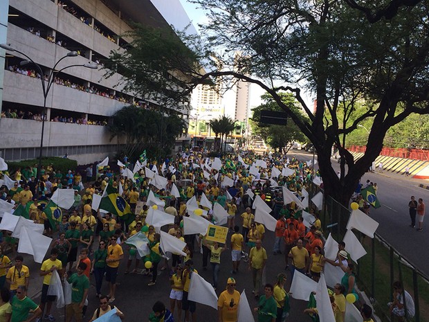 Um grande grupo de manifestantes se reuniu na tarde deste domingo (15), em Natal, para protestar contra o governo da presidente Dilma Roussef (PT) e a corrupção. O protesto foi organizado por um grupo de profissionais liberais, empresários e servidores públicos. Os manifestantes se concentraram nas imediações do shopping Midway Mall e percorreram a avenida Hermes da Fonseca até a rua Miguel Castro, na Zona Sul de Natal. De acordo com a Polícia Militar, 15 mil pessoas participam do ato. Já os organizadores da manifestação estimam a participação de mais de 40 mil pessoas. Os manifestantes usaram as cores verde e amarela e camisas que pediam o impeachment da presidente Dilma.