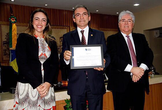 O presidente do Sistema Fecomercio, empresário Marcelo Queiros, recebeu esta semana homenagem da Câmara Municipal de Natal, quando foi realizada a solenidade que marcou a passagem do Dia do Administrador. A homenagem foi prestada pela vereadora Ana Paula, durante aquela sessão solene. Marcelo disse naquela oportunidade, que sempre admirou a profissão de Administrador, e que hoje em dia, quando as empresas e instituições precisam zelar pela eficiência e eficácia, a profissão tem sido cada vez mais importante no mercado. Na foto acima, o presidente da Fecomercio está ladeado pela vereadora Ana Paula e pelo vereador Sueldo Medeiros.
